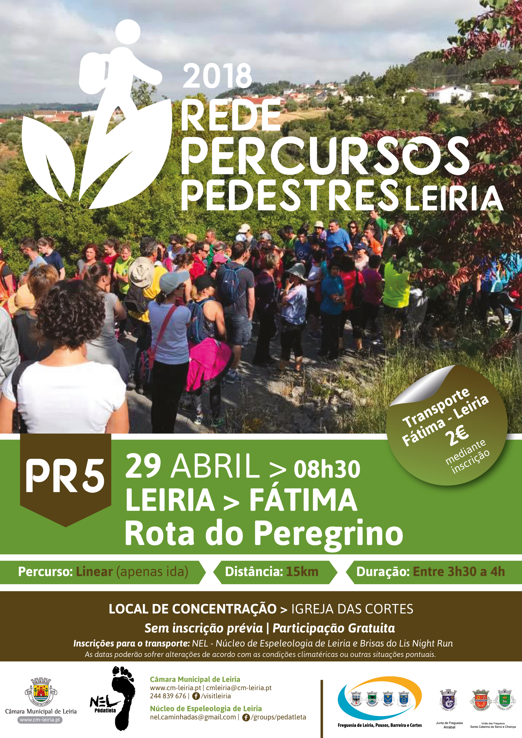 Dia 29 de abril terá lugar a 4ª Edição do Percurso Pedestre de Leiria da “Rota do Peregrino”, que consiste numa caminhada de Leiria (Cortes) a Fátima, uma iniciativa do Município de Leiria em parceria com o Núcleo de Espeleologia de Leiria.