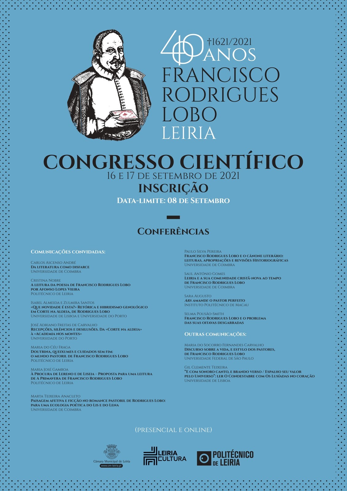 Encontram-se abertas as inscrições para o Congresso Científico Francisco Rodrigues Lobo, evento que irá acontecer em Leiria nos dias 16 e 17 de setembro, no Teatro José Lúcio da Silva.