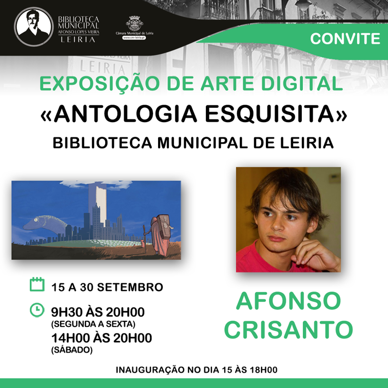 “Antologia Esquisita”, a exposição de Arte Digital de Afonso Crisanto, é inaugurada no dia 15 de setembro, às 18 horas, na Biblioteca Municipal Afonso Lopes Vieira, onde fica patente até ao final do mês.