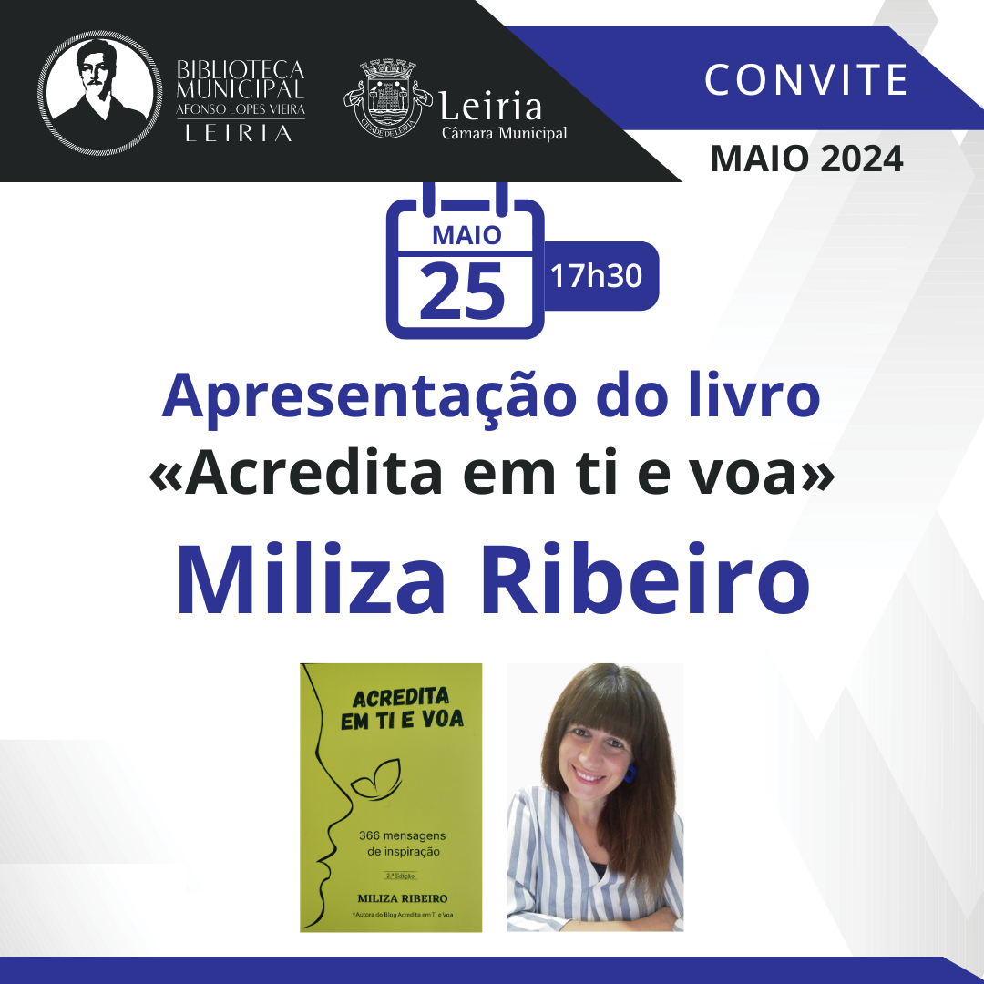 No próximo dia 25 de maio, pelas 17h30, será apresentado o livro "Acredita em Ti e Voa" da autora Miliza Ribeiro, na Biblioteca Municipal de Leiria.