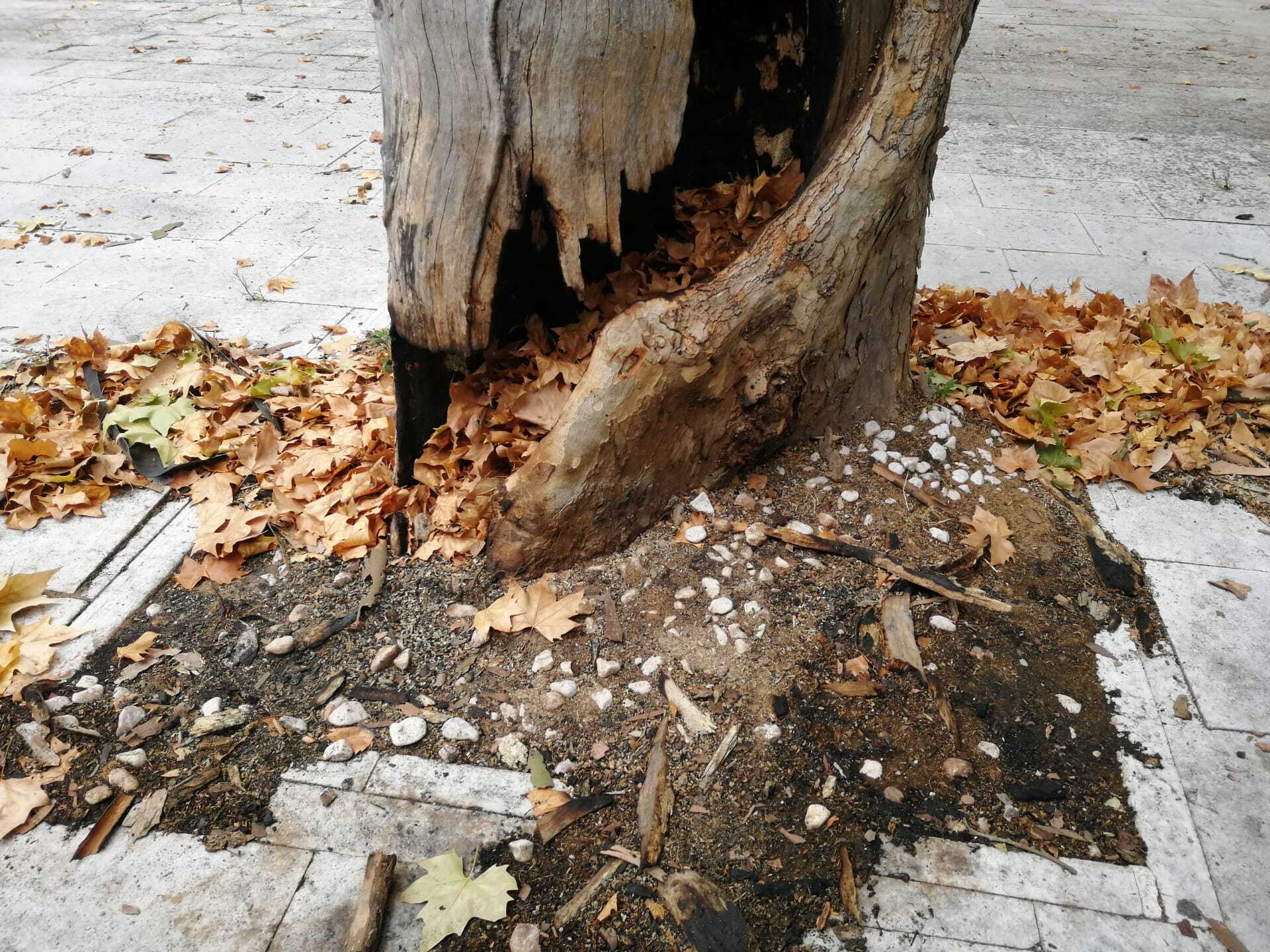 Árvore em risco de queda após ato de vandalismo
