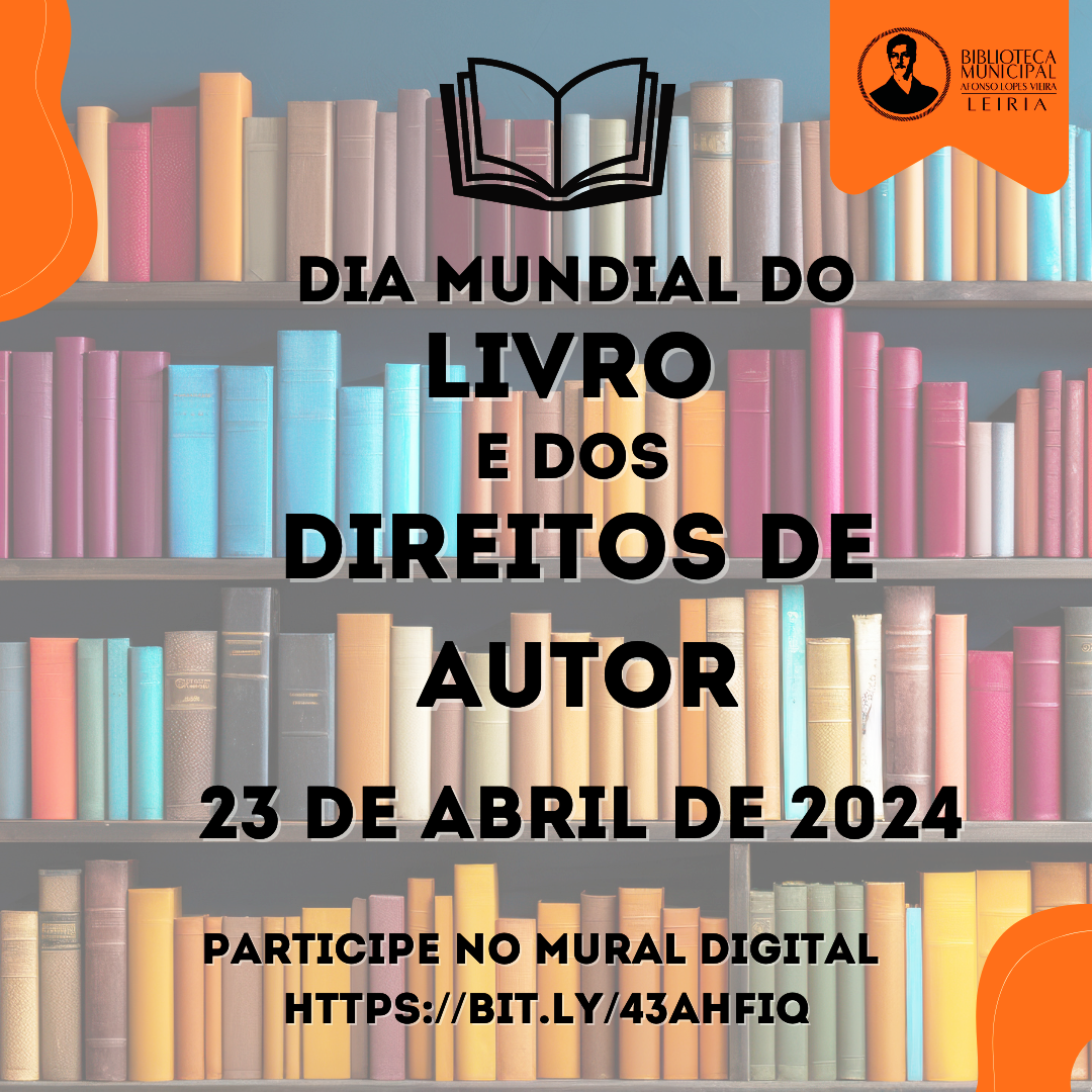 No âmbito da comemoração do «Dia Mundial do Livro e dos Direitos de Autor», dia 23 de abril de 2024, a Biblioteca Municipal Afonso Lopes Vieira, em Leiria, convida todos os leitores e o público em geral a partilharem as suas leituras atuais, através de um mural digital, disponível nas redes socias da Biblioteca Municipal, no dia 23 de abril, a partir das 10h00.