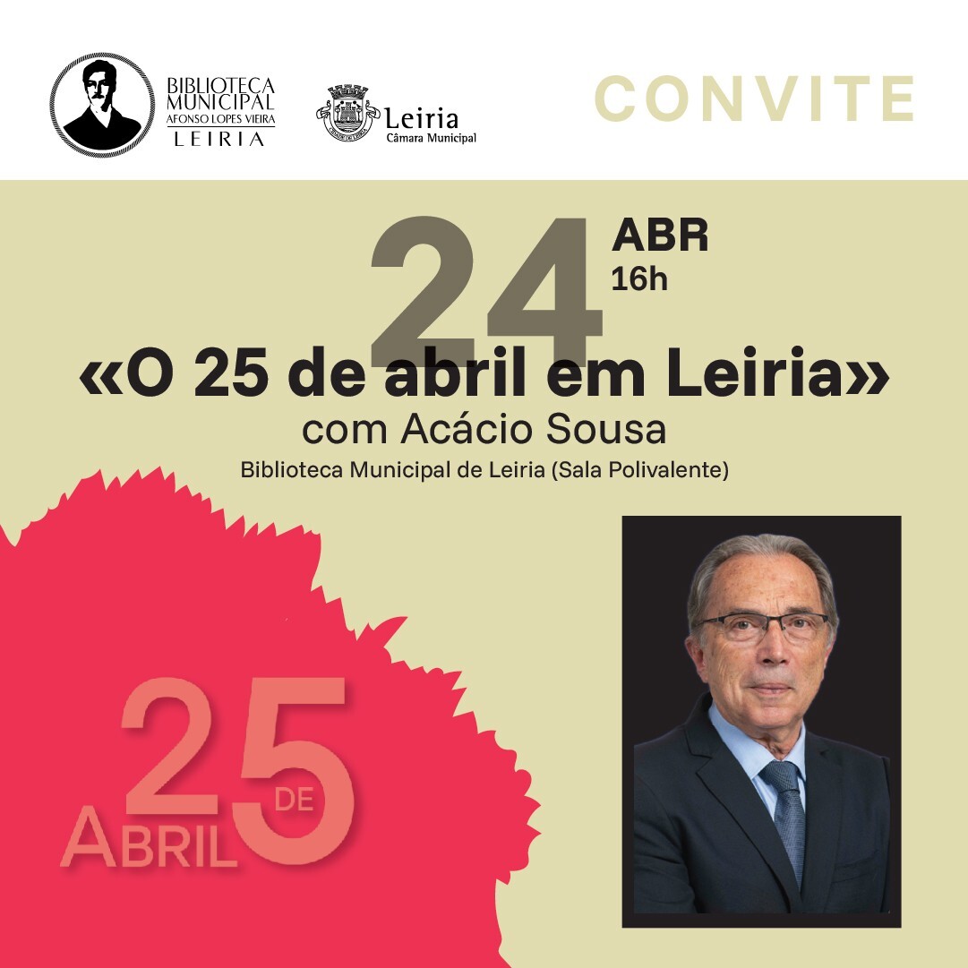 A Biblioteca Municipal Afonso Lopes Vieira, em Leiria, vai acolher no próximo dia 24 de abril de 2026, pelas 16h00, o Encontro Temático «O 25 de abril em Leiria», uma iniciativa que pretende assinalar a Revolução dos Cravos e refletir sobre o seu impacto a nível local. O evento contará com a participação do historiador Acácio Sousa como orador convidado.