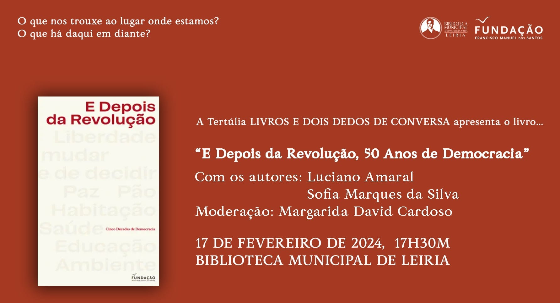 A Biblioteca Municipal de Leiria recebe, dia 17 de fevereiro, às 17h30, a sessão de apresentação do livro “E depois da Revolução, Cinco Décadas de Democracia”, numa conversa moderada pela autora e jornalista Margarida David Cardoso, com a participação de dois autores - Sofia Marques da Silva e Luciano Amaral, integrada na Tertúlia Livros e Dois Dedos de Conversa, uma iniciativa da Biblioteca, resultante de uma parceria com a Fundação Manuel dos Santos.