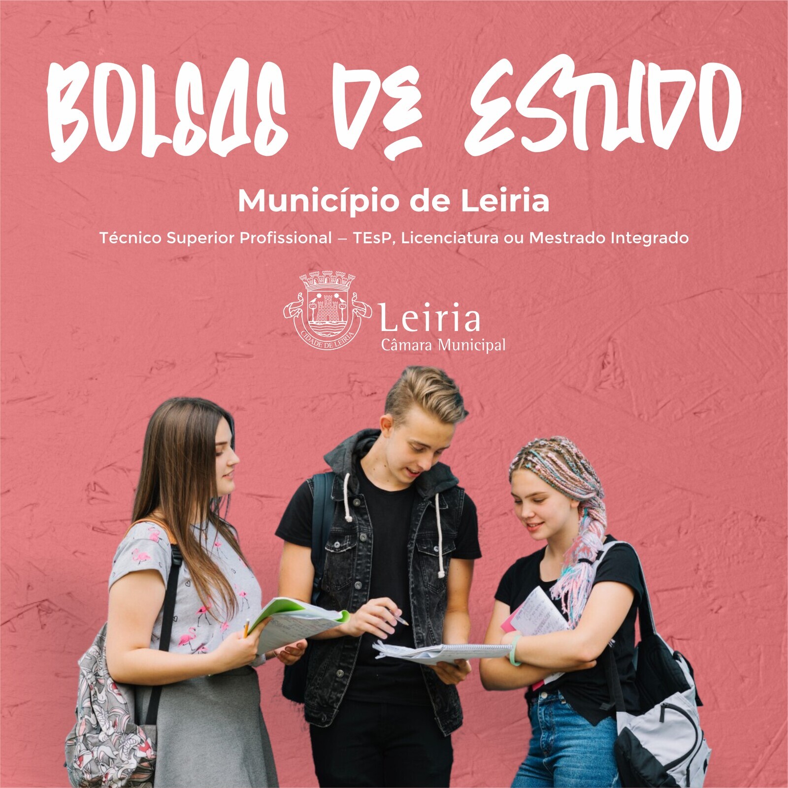 Este apoio, que corresponde a 100 bolsas de estudo, no valor de 750€ cada, é dirigido aos estudantes do Ensino Superior residentes no concelho de Leiria, que ingressem ou frequentem estabelecimentos de ensino superior, em território nacional, para obtenção de grau académico de Técnico Superior Profissional — TEsP, Licenciatura ou Mestrado Integrado.