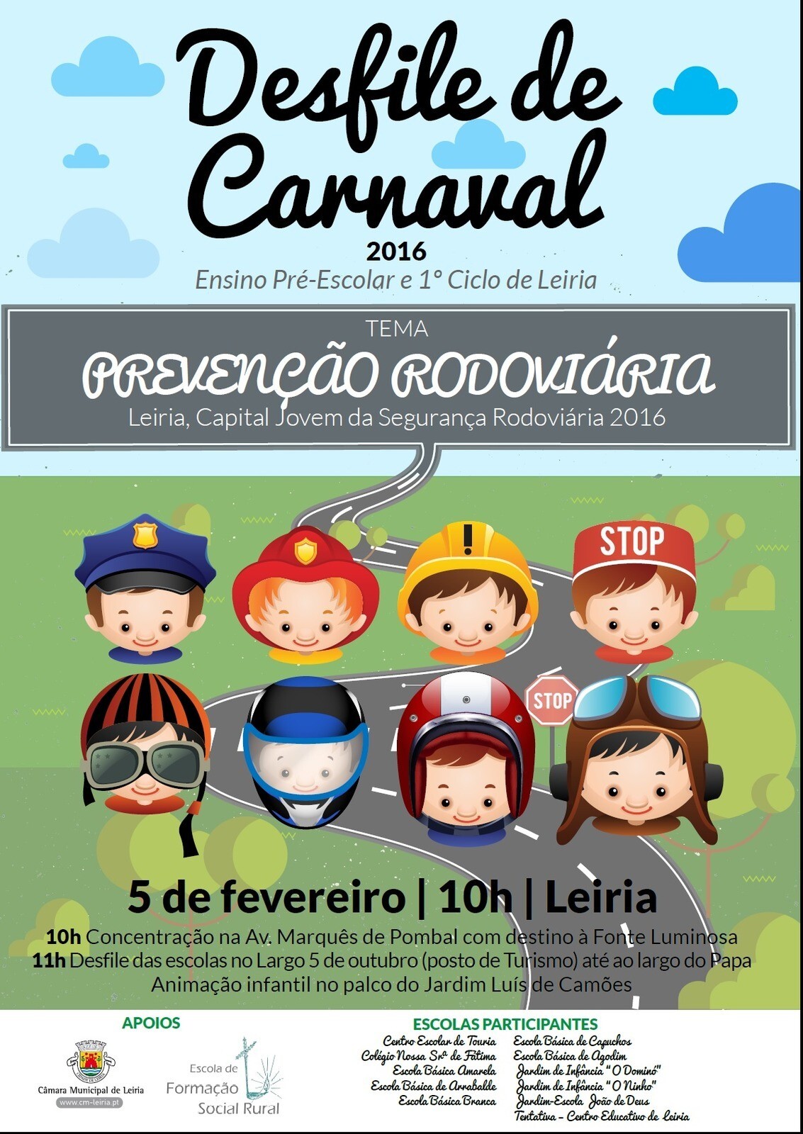 Um ‘corso’ carnavalesco de 1.450 crianças do ensino pré-escolar e 1º Ciclo vai sair à rua no próximo dia 5 de Fevereiro, uma iniciativa do município que este ano associa o Desfile de Carnaval à programação da iniciativa ‘Leiria, Capital Jovem da Segurança Rodoviária’.