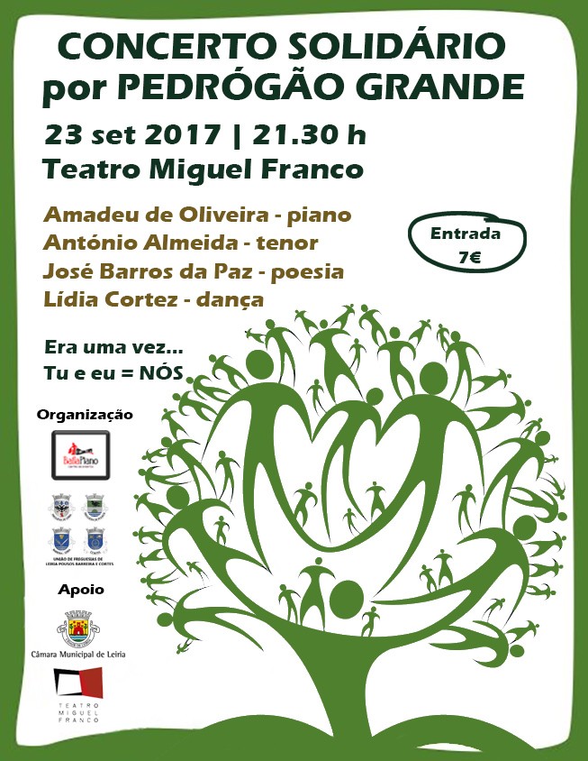 O Teatro Miguel Franco, em Leiria, recebe, dia 23 de setembro, às 21:30, um concerto solidário por Pedrógão Grande, com Amadeu de Oliveira, piano, António Almeida, tenor, José Barros da Paz, poesia, e Lídia Cortez, dança.