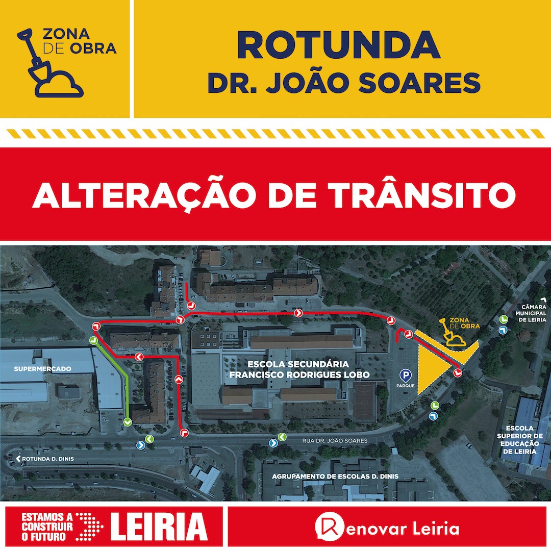 A Câmara Municipal de Leiria informa que foram autorizados os condicionalismos ao trânsito necessários para a realização da empreitada a decorrer na rua Dr. João Soares e rua Dr. Afonso Lopes Vieira, em Leiria, bem como os respetivos desvios.