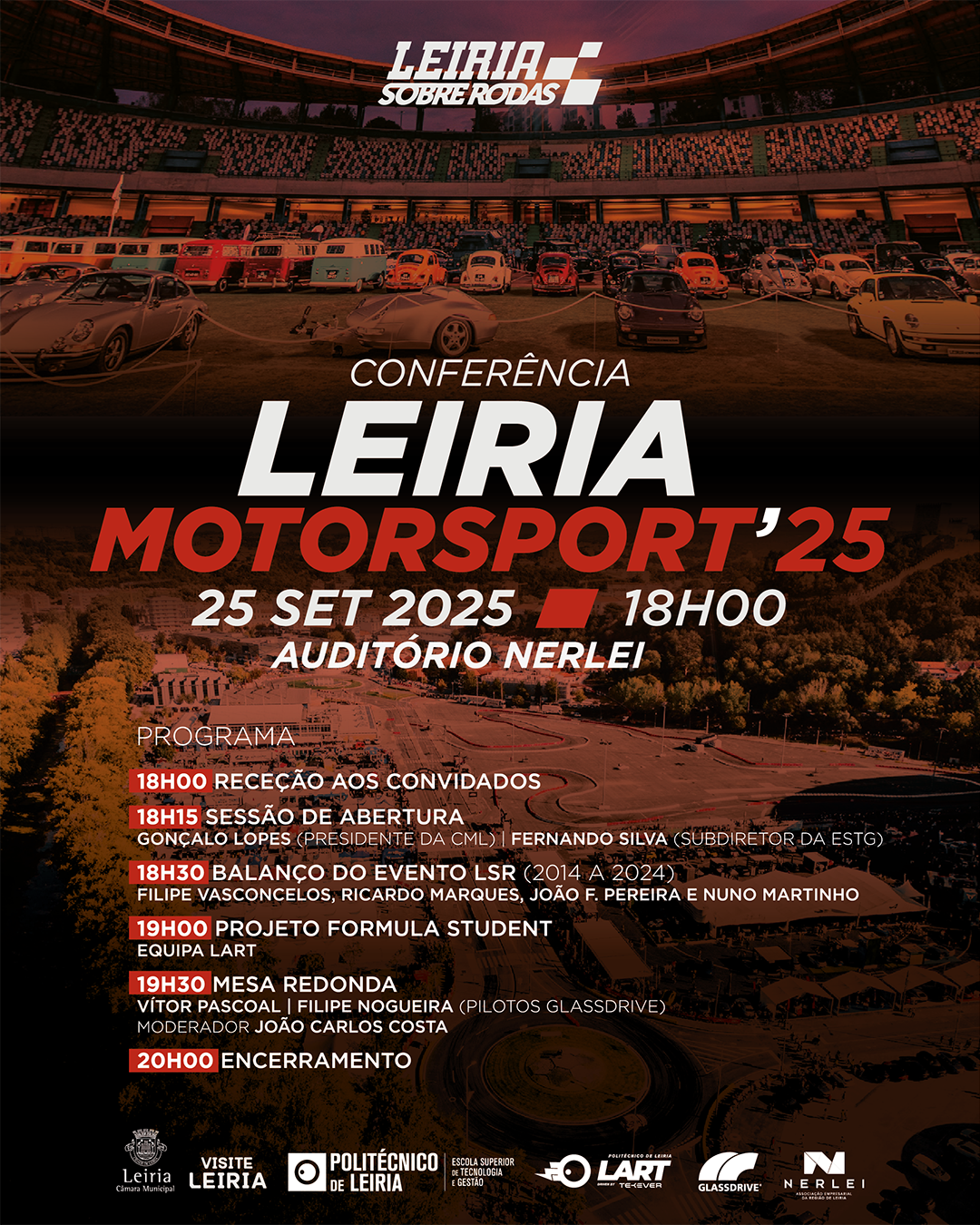 A Câmara Municipal de Leiria (CML) e a Escola Superior de Tecnologia e Gestão (ESTG) do Politécnico de Leiria convidam o público para a conferência LEIRIA MOTOSPORT 25, a realizar-se no dia 25 de setembro, às 18h00, no Auditório do NERLEI. O evento, de entrada livre, oferece um programa que se divide em três momentos principais.
