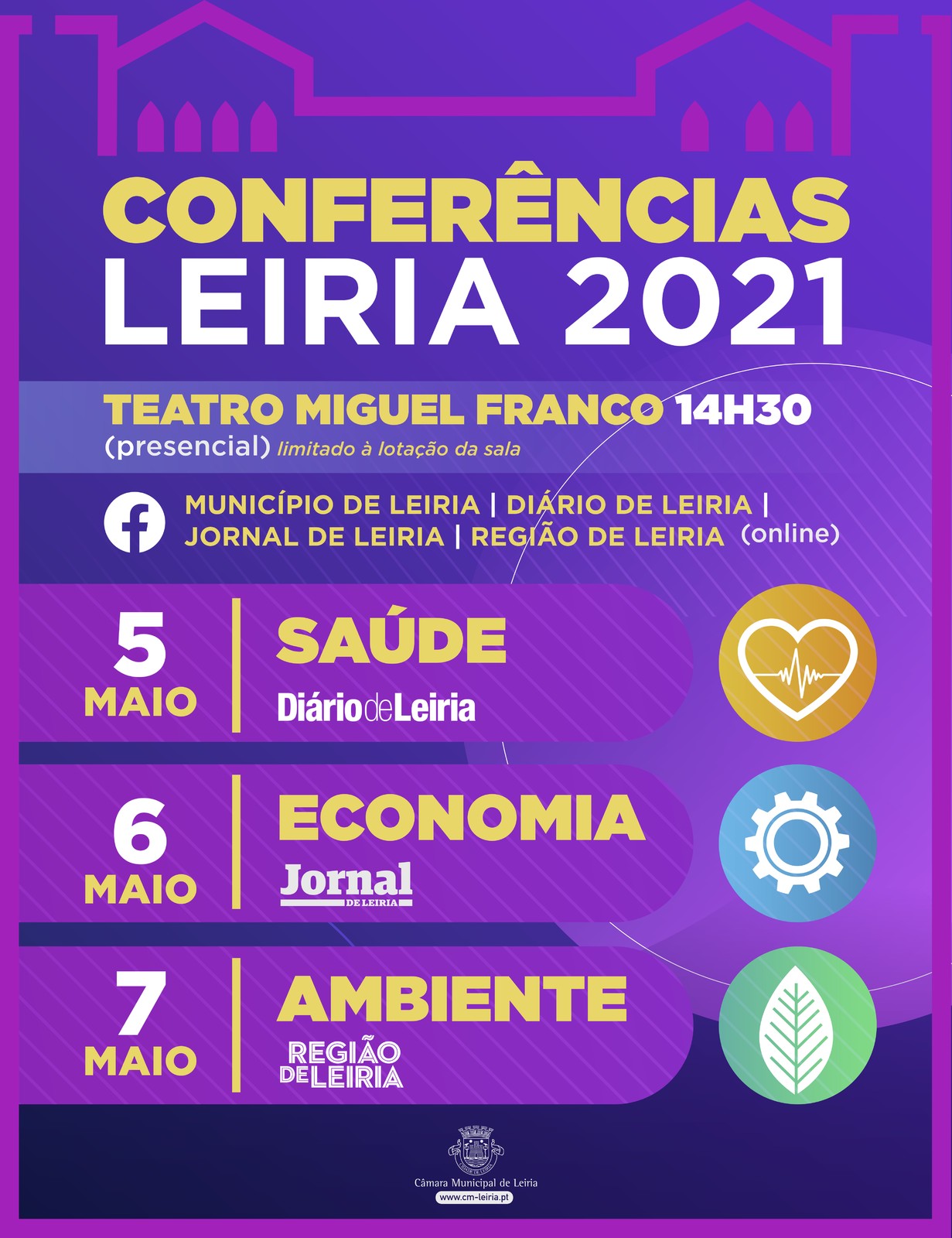 O Município de Leiria promove, nos dias 5, 6 e 7 de maio, três conferências com o objetivo de tomar o pulso a três temas que marcam a atualidade - Saúde, Economia e Ambiente -, uma iniciativa com a colaboração dos jornais Diário de Leiria, Jornal de Leiria e Região de Leiria.