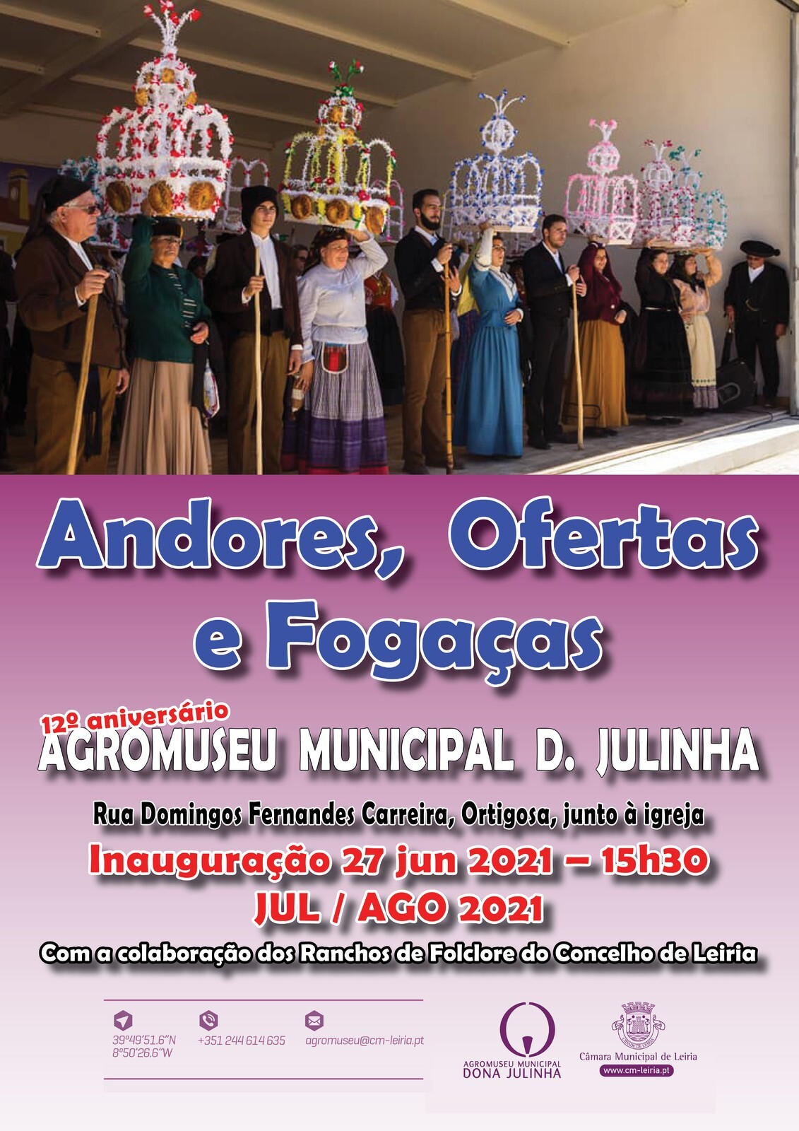 O Município de Leiria vai inaugurar, no próximo dia 27 de junho, pelas 15h30, no Agromuseu Municipal Dona Julinha, Ortigosa, uma exposição dedicada às festas e romarias, com a apresentação de andores, ofertas e fogaças ornamentais por 18 grupos de folclore do concelho, uma iniciativa no âmbito do 12.º aniversário deste espaço museológico.