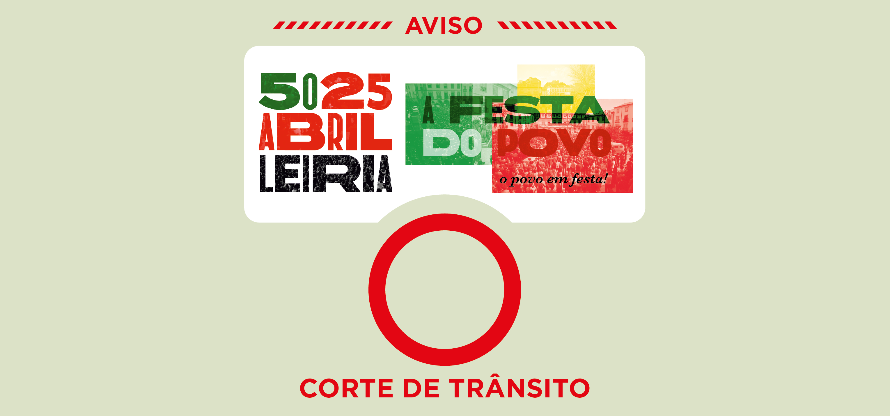 No âmbito da realização do evento cultural ‘FESTA DO POVO - 50 ANOS DO 25 DE ABRIL”, organizado pelo Município de Leiria, entre os dias 24 e 28 de abril será necessário proceder ao corte de trânsito no Rossio de Leiria, entre a rotunda do Sinaleiro e o largo Papa Paulo VI, nos seguintes períodos: