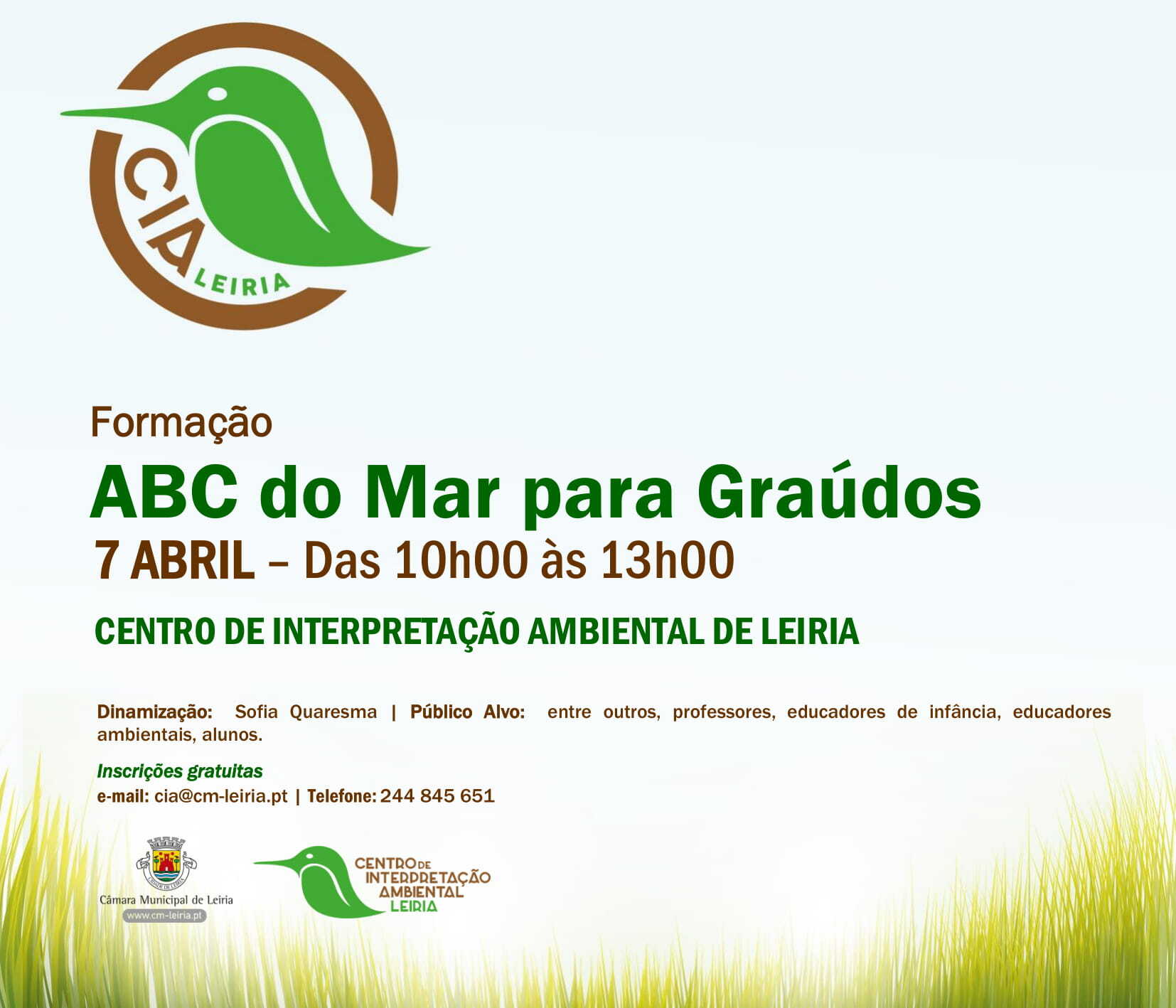 O Centro de Interpretação Ambiental de Leiria recebe dia 07 de abril, das 10:00 às 13:00, uma ação com o tema "Formação ABC do Mar para graúdos", destinada a professores, educadores de infância, educadores ambientais, alunos e público em geral.
