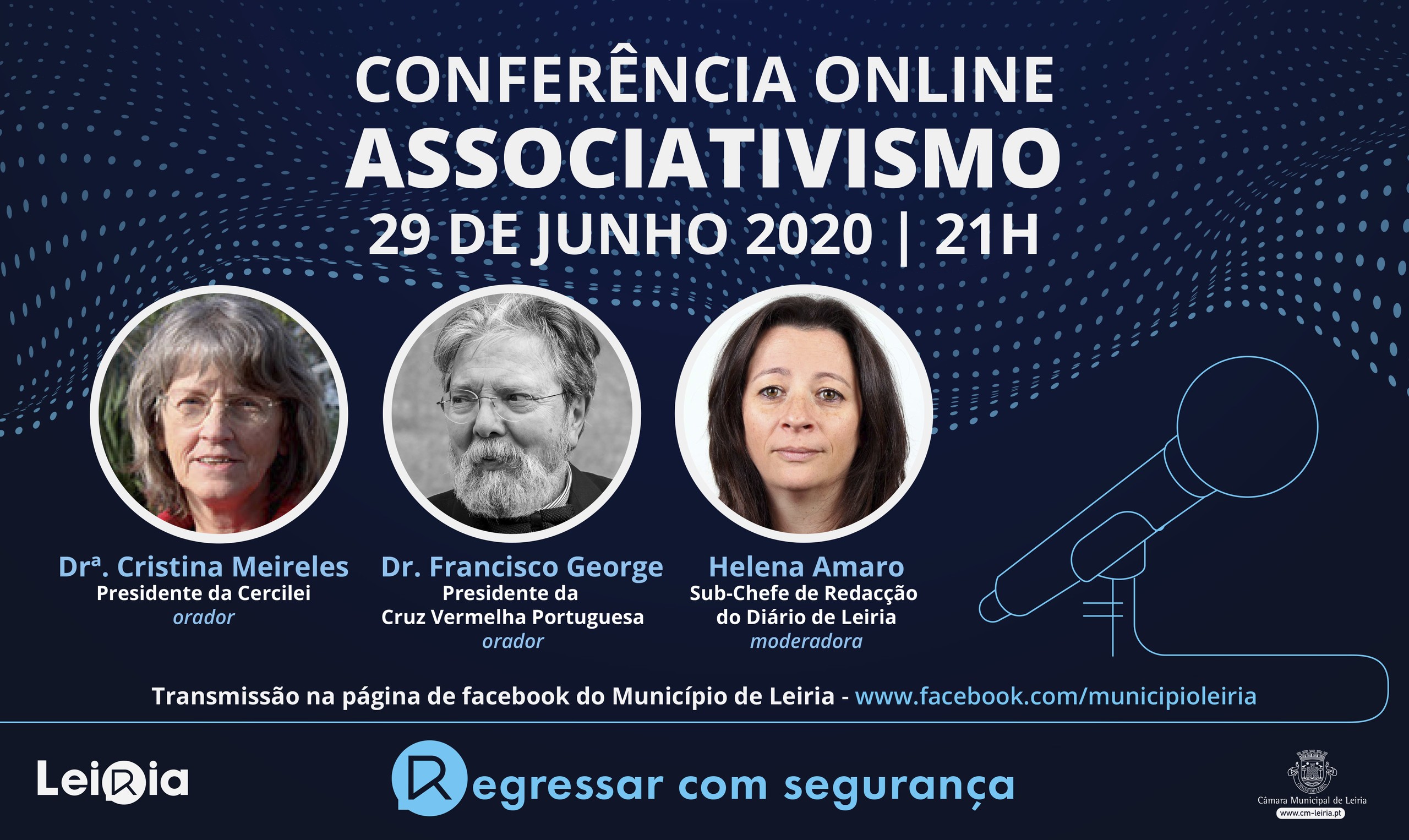 O Município de Leiria promove, dia 29, uma conferência sobre o tema Associativismo, no âmbito da pandemia Covid-19, com a participação do presidente da Cruz vermelha Portuguesa, Francisco George, e da presidente da Cercilei, Cristina Meireles, ficando a moderação a cargo da jornalista Helena Amaro, sub-chefe de Redação do Diário de Leiria.