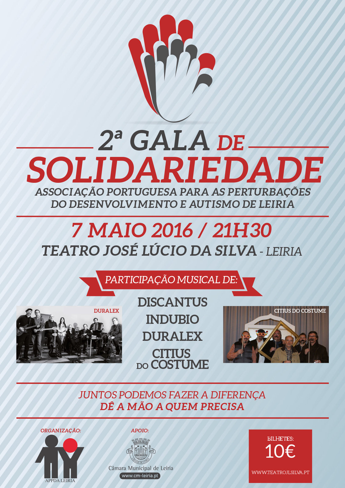 Leiria vai receber dia 07 de maio a segunda Gala de Solidariedade, este ano com o lema “Juntos Podemos Fazer a Diferença - Dê a mão a Quem Precisa”, em favor da Associação Portuguesa para as Perturbações do Desenvolvimento e Autismo de Leiria (APPDA).