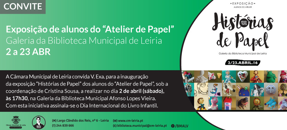 A Biblioteca Municipal de Afonso Lopes Vieira, em Leiria, e o Atelier de Papel comemoram sábado, dia 2 de Abril, às 17h30, o Dia Internacional do Livro Infantil, com a inauguração da exposição “Histórias de Papel”, na galeria da Biblioteca Municipal.
