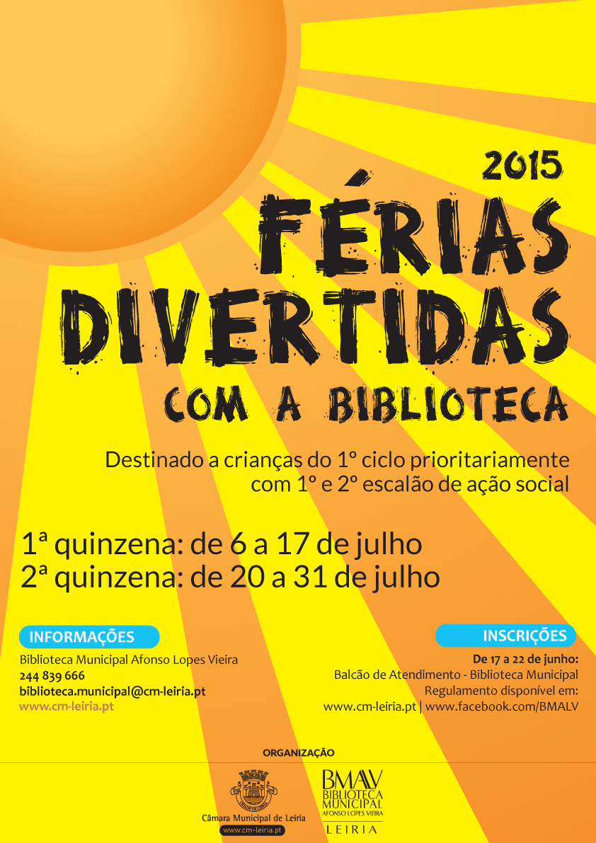 Entre 17 e 22 de junho estão abertas as inscrições para o programa “Férias Divertidas com a Biblioteca”, na Biblioteca Municipal Afonso Lopes Vieira (BMALV) em Leiria, devendo os interessados dirigir-se ao balcão central, acompanhados do cartão do cidadão da criança e documento comprovativo de escalão.