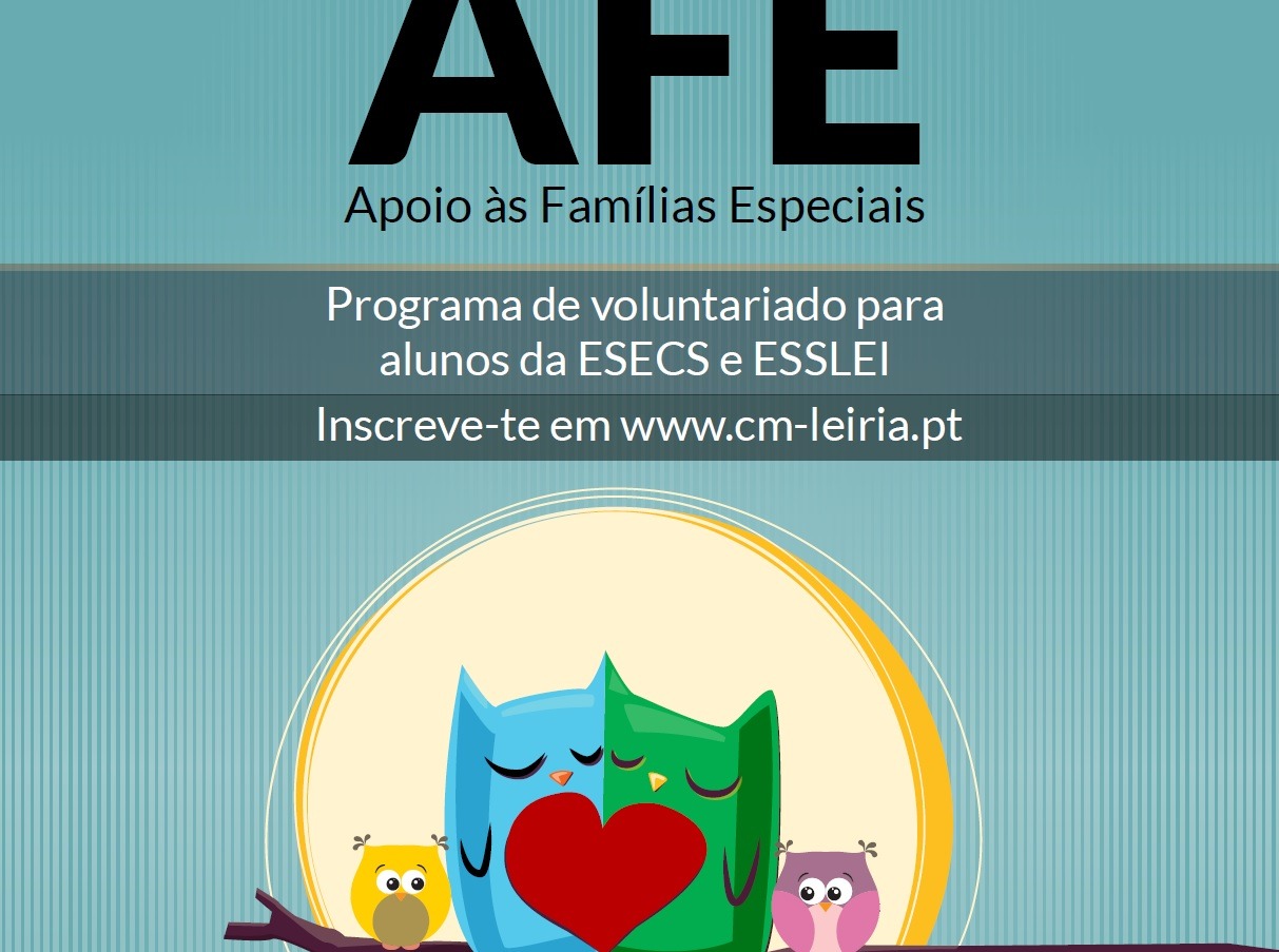 Estão abertas até ao dia 18 de outubro, as candidaturas para os alunos da Escola Superior de Educação Ciências Sociais e da Escola Superior de Saúde de Leiria que pretendam voluntariar-se ao Programa de Apoio às Famílias Especiais (AFE).