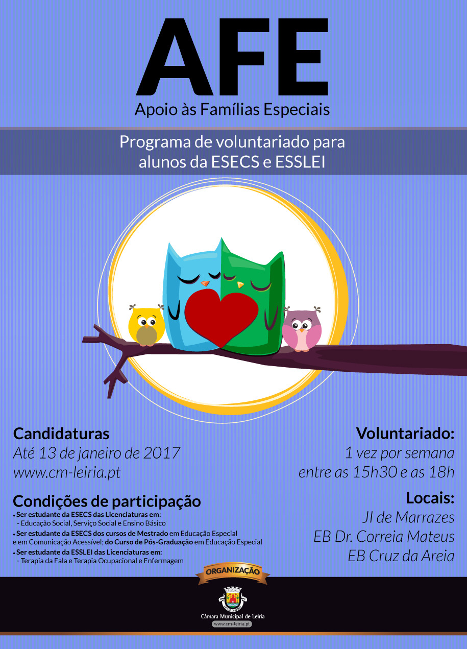 Estão abertas, até ao dia 13 de janeiro, candidaturas para os alunos da Escola Superior de Educação e Ciências Sociais e da Escola Superior de Saúde de Leiria que pretendam voluntariar-se no Programa de Apoio às Famílias Especiais (AFE).