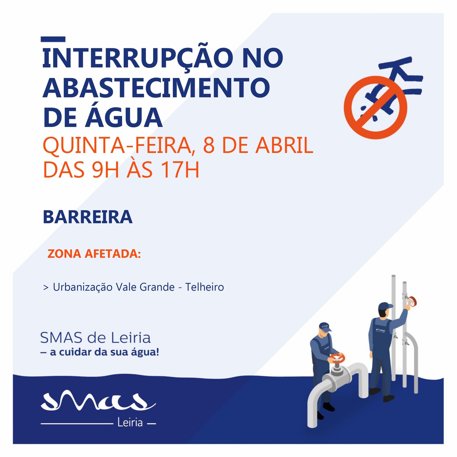 Na sequência dos trabalhos de remodelação da Estação Elevatória do Telheiro, no próximo dia 8 de abril, entre as 9:00 e as 17:00, os SMAS de Leiria irão proceder a uma intervenção que provocará perturbações no abastecimento de água, na Urbanização Vale Grande – Telheiro.