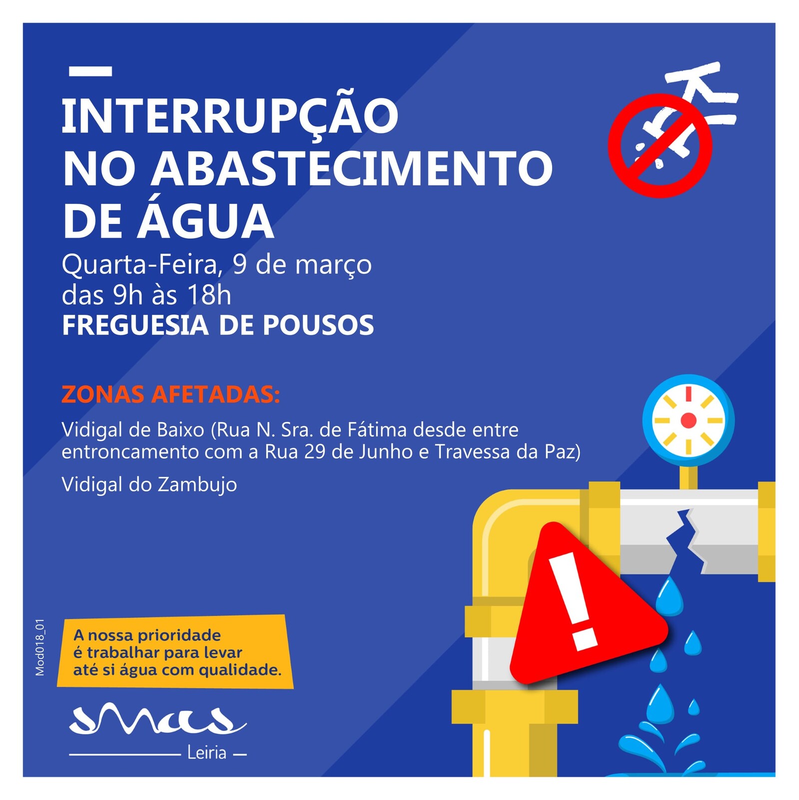 A Câmara Municipal de Leiria e os SMAS informam que na sequência das obras de Ligação da Rede Água da Rua Nossa Sra. de Fátima, no Vidigal (Pousos), no próximo dia 9 de março (quarta-feira), entre as 9:00 e as 18:00 poderão ocorrer perturbações no abastecimento de água.