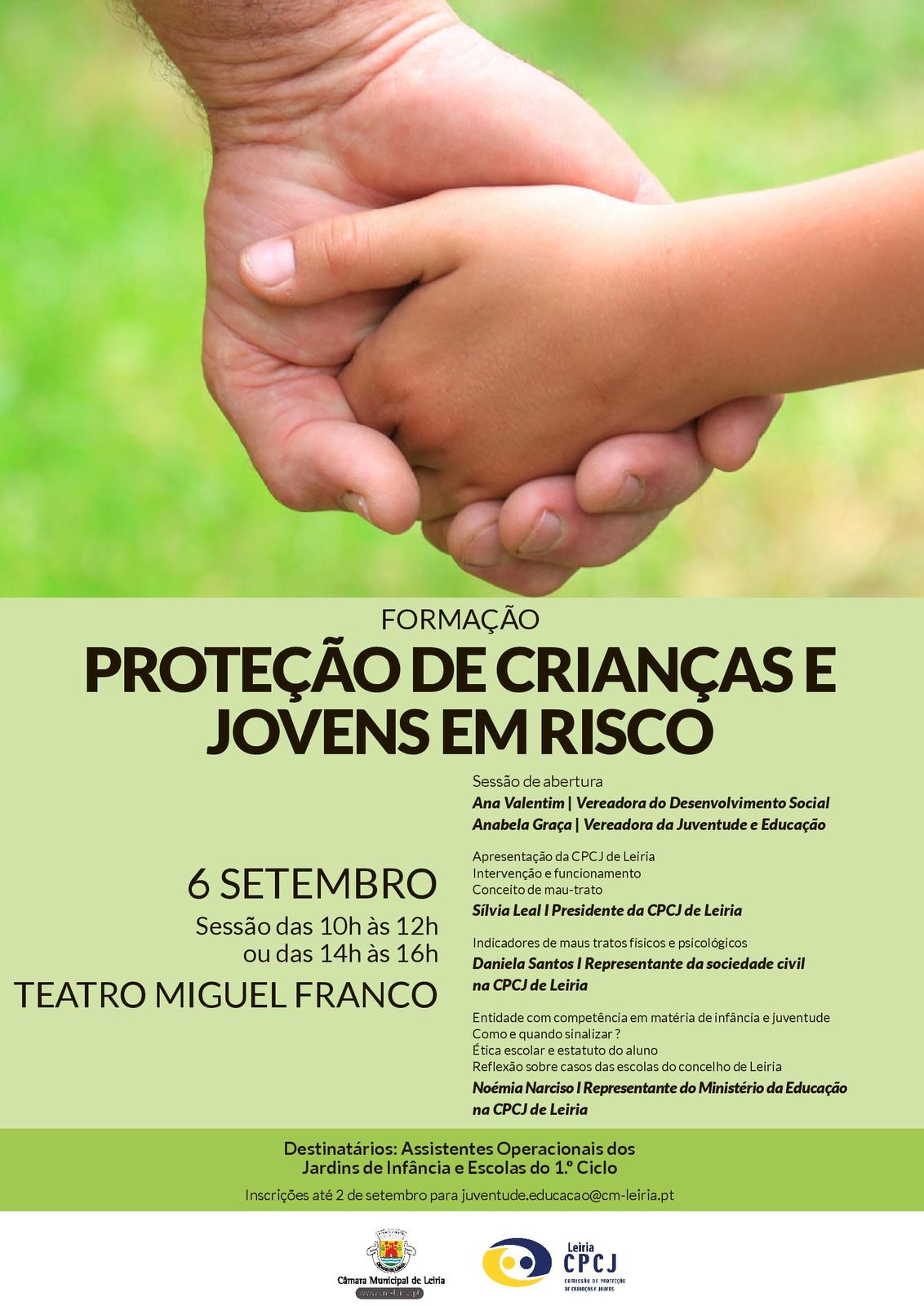 O Município de Leiria e a Comissão de Proteção de Crianças e Jovens em Risco (CPCJ) de Leiria vão realizar dia 6 de setembro, no Teatro Miguel Franco, em Leiria, uma ação de formação subordinada ao tema "Proteção de Crianças e Jovens em Risco”.