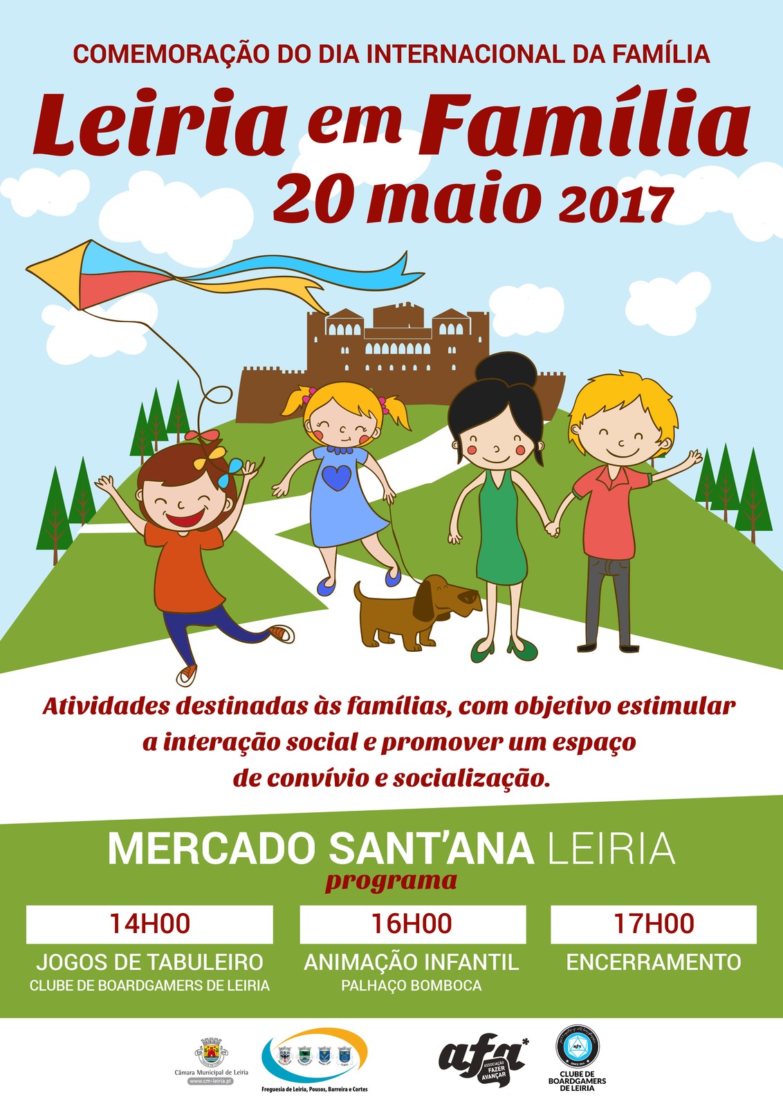 Com início às 14:00, no Mercado Sant’Ana, a celebração do Dia Internacional da Família contará com a participação do Clube de Boardgamers de Leiria – Associação Fazer Avançar, que facultará às famílias a possibilidade de experimentarem jogos de tabuleiro, desconhecidos da maior parte do público, e que convidam a vários desafios a realizar por pequenos e graúdos, seguido de um momento de animação infantil, com o já conhecido “Palhaço Bomboca”.