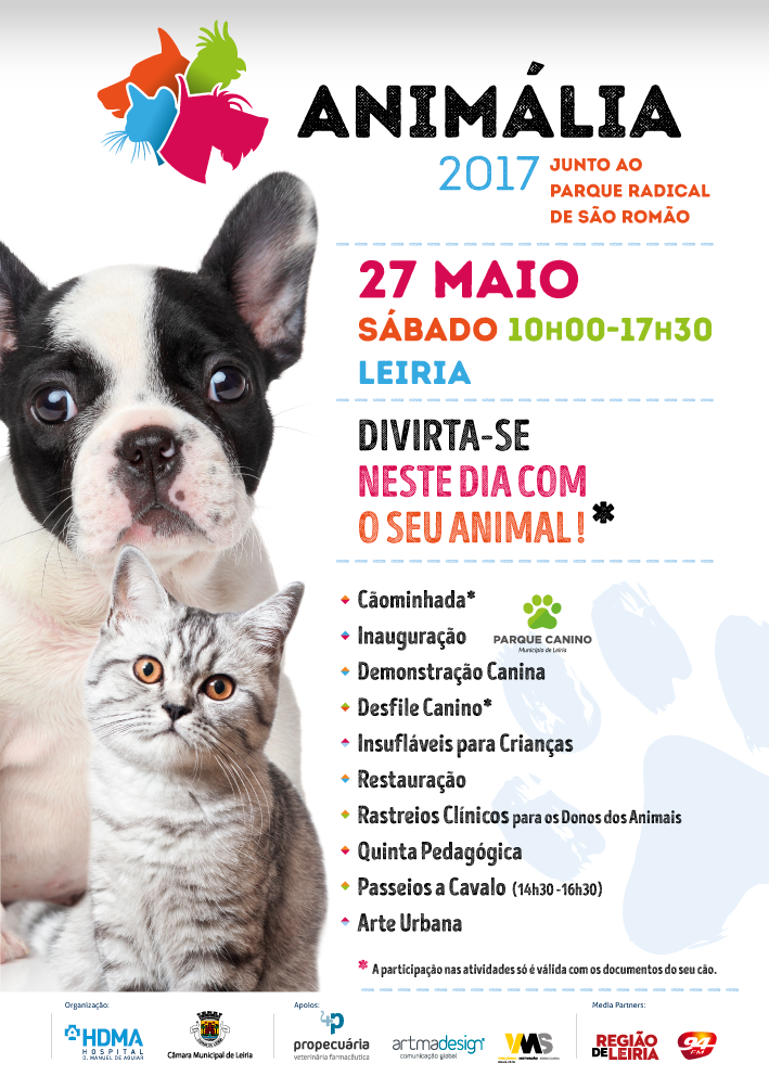A inauguração de um parque canino, a apresentação do “site" do Centro de Recolha Oficial [Canil de Leiria], uma campanha de sensibilização contra os maus-tratos e abandono, um desfile canino e uma "cãominhada” marcam a festa Animália 2017, que decorre em Leiria no próximo dia 27 de maio, entre as 10:00 e as 17:30, junto ao Parque Radical de S. Romão.