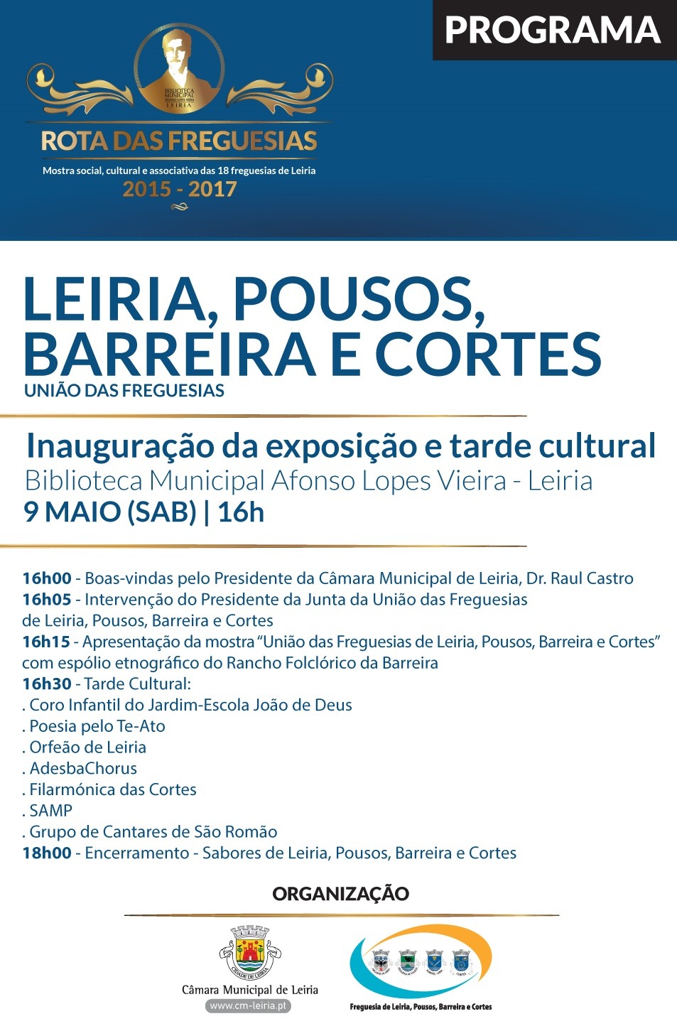 A União das Freguesias de Leiria, Pousos, Barreira e Cortes dá continuidade ao projeto “Rota das Freguesias”, no sábado, dia 9 de maio, a partir das 16 horas, com a inauguração de uma exposição e tarde cultural, na Biblioteca Municipal Afonso Lopes Vieira (BMALV).
