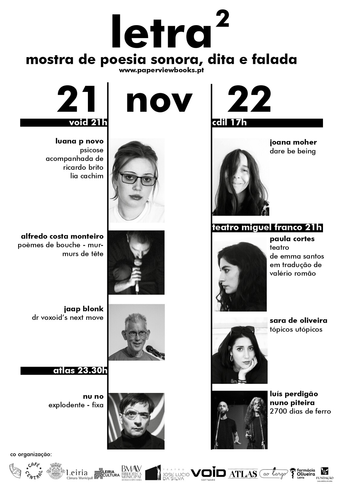 letra² é uma coorganização da Paper View, Café Central e Câmara Municipal de Leiria, com apoios da Void, Farmácia Oliveira e Fundação Caixa Agrícola de Leiria.