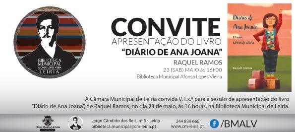 Raquel Ramos apresenta no sábado, dia 23 de maio, às 16 horas na Biblioteca Municipal Afonso Lopes Vieira, em Leiria, o seu livro “Diário de Ana Joana: 12 anos, 1,36 m de altura”