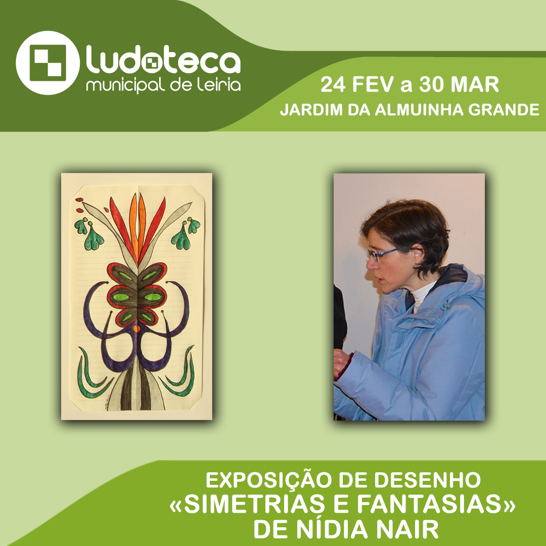 A Ludoteca Municipal de Leiria, no Jardim da Almuinha Grande, recebe a exposição de desenho “Simetrias e Fantasias”, de Nídia Nair, a partir de dia 24 de fevereiro, ficando patente até 30 de março.