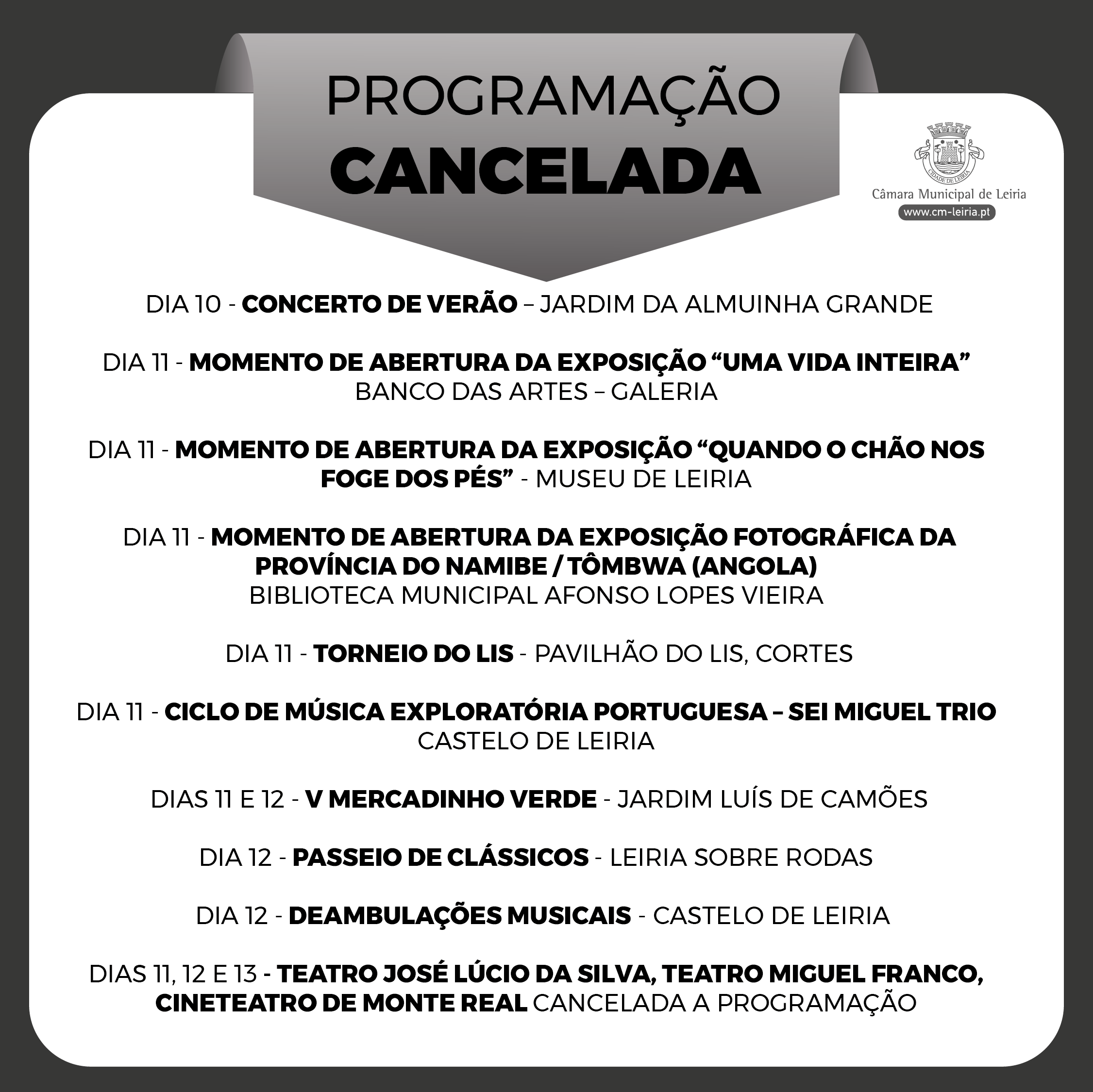 Oportunamente serão apresentadas novas datas para a realização das iniciativas acima referidas. Informamos ainda que os espaços museológicos e galerias do Município de Leiria continuarão a funcionar no horário normal.
