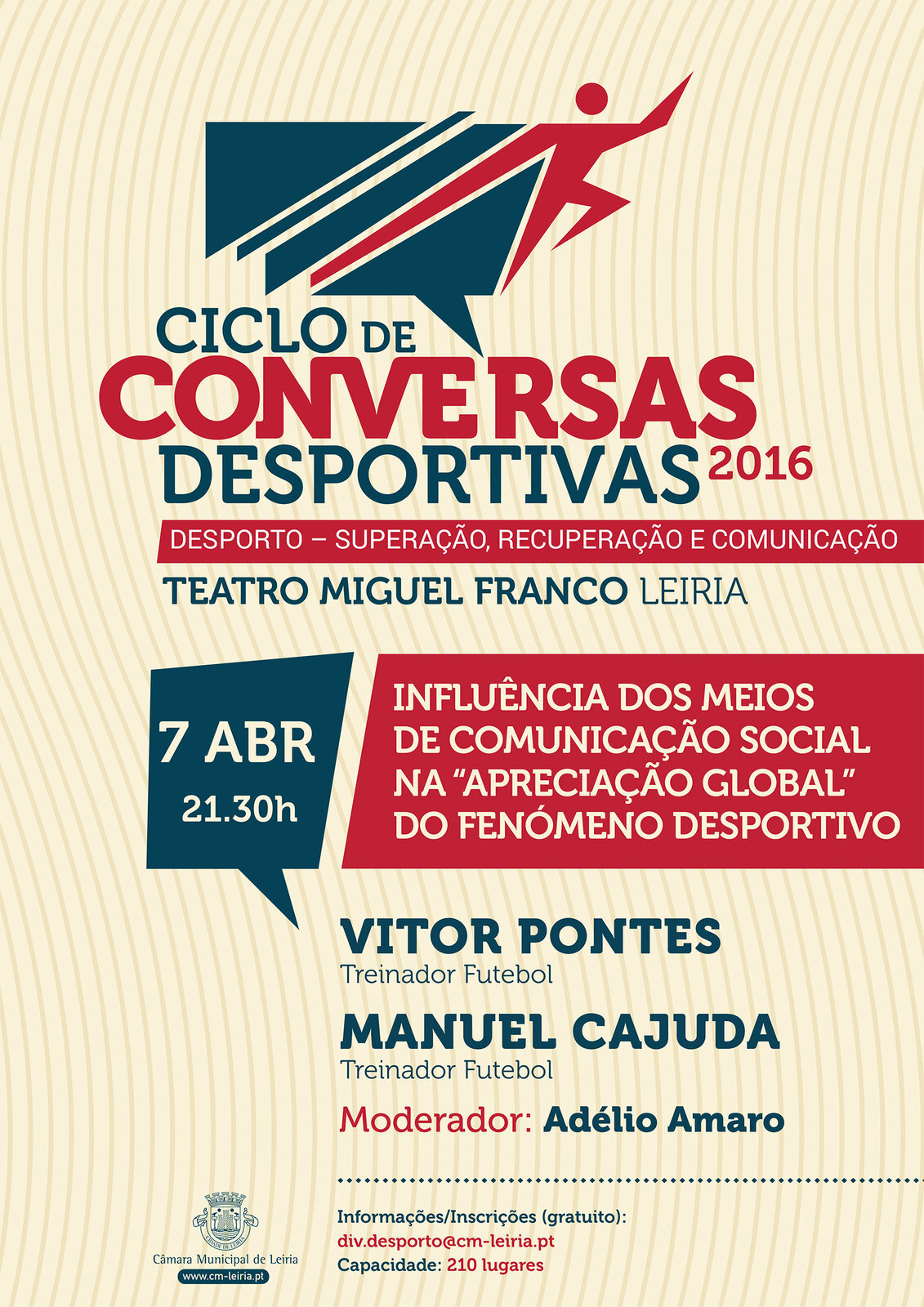 No Ciclo de Conversas Desportivas Leiria 2016, a realizar nas primeiras quintas-feiras entre os meses de fevereiro a abril, serão lançados diferentes olhares sobre o “Fenómeno Desportivo”, convidando palestrantes de reconhecida idoneidade.