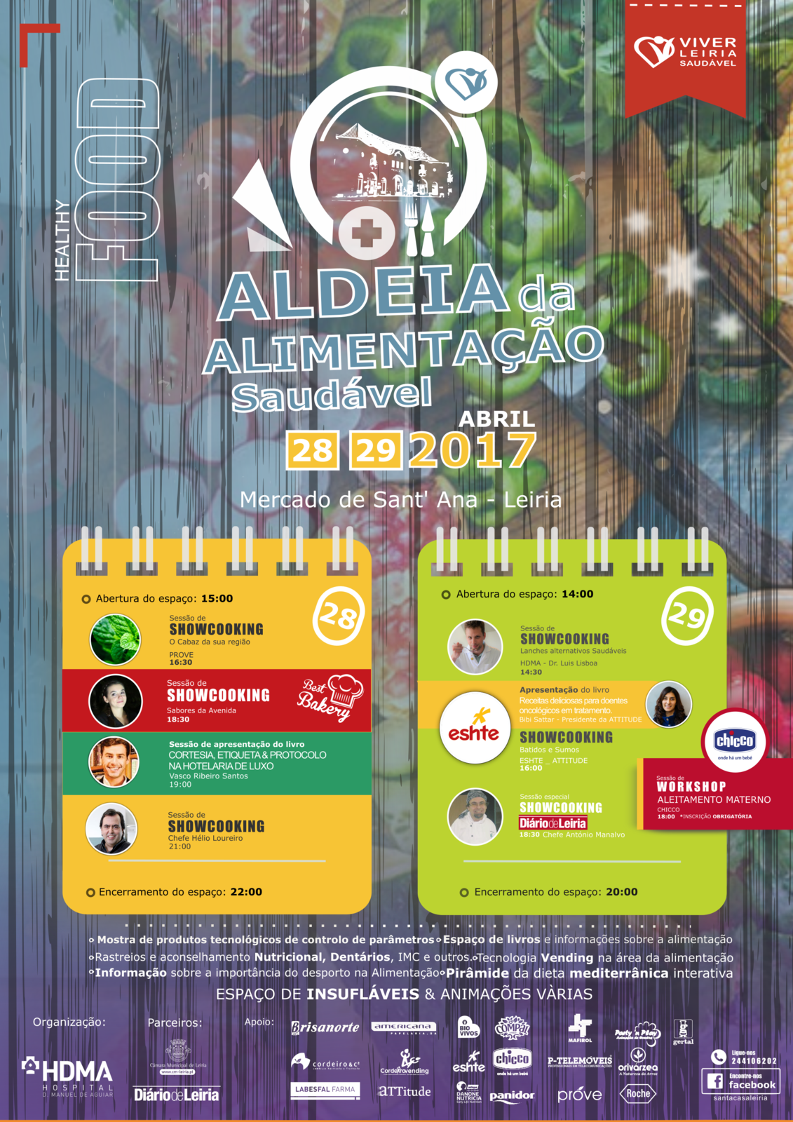 Sessões de showcooking, apresentações de livros, workshops, aconselhamento nutricional e rastreios são alguns dos destaques do programa, desenvolvido no âmbito “Leiria Tem Saúde”, um projeto do Município de Leiria que teve início em 2013, com o objetivo de promoção da saúde e estilos de vida saudáveis.