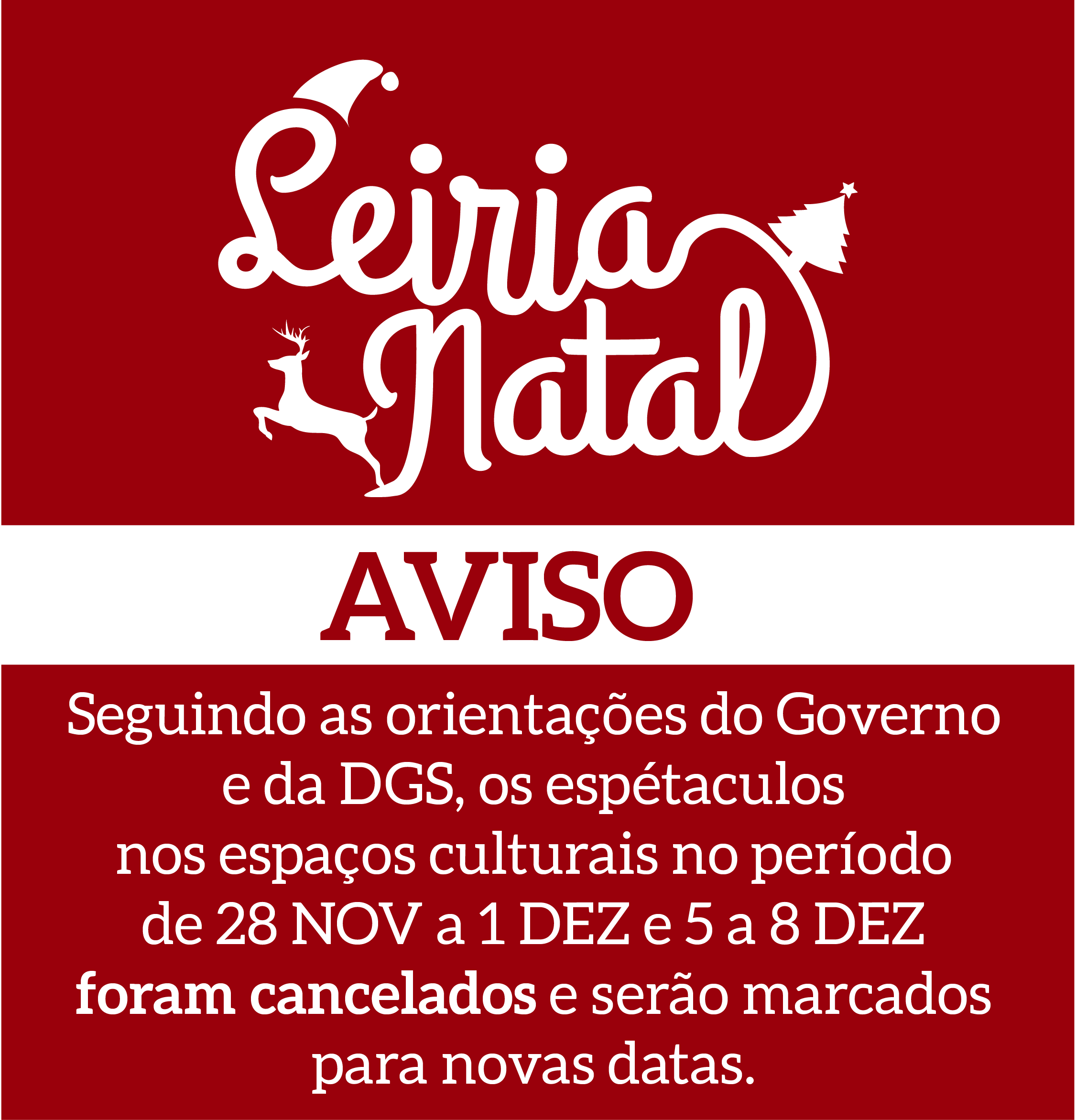 O Município de Leiria adiou os eventos previstos na programação do Leiria Natal entre os dias 28 de novembro e 1 de dezembro e entre 5 e 8 dezembro, na sequência do encerramento dos espaços culturais municipais nos próximos dois fins de semana.