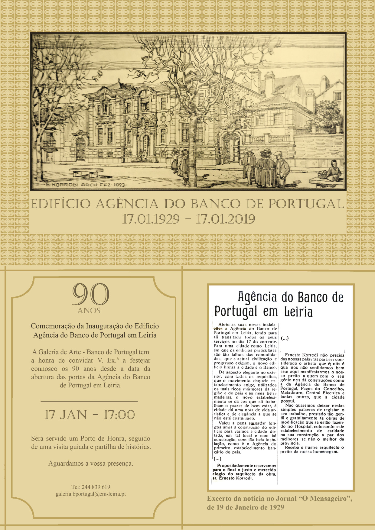 O Município de Leiria vai assinalar 90 anos da inauguração do Edifício Agência do Banco de Portugal, dia 17 de janeiro, às 17:00. A data será assinalada com uma sessão em que será servido um porto de honra, seguindo-se uma visita guiada e partilha de histórias por quem trabalhou naquele espaço.
