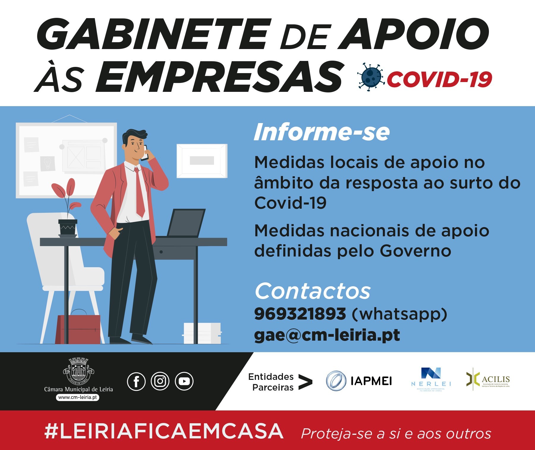 O Município de Leiria tem disponível um Gabinete de Apoio às Empresas (GAE), no âmbito do pacote de medidas extraordinárias na sequência da pandemia do COVID-19.