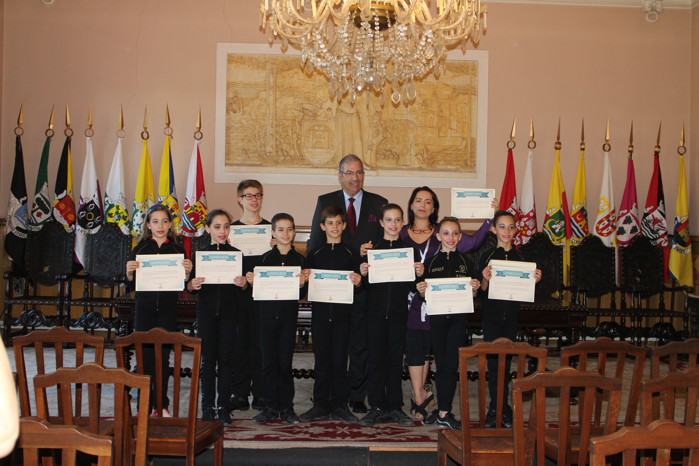 Seguiu-se a entrega de certificados de reconhecimento e agradecimento do Município de Leiria aos alunos premiados no YAGP 2015, bem como a Annarella, que em nome da sua Academia recebeu este certificado pelo prémio também alcançado em Nova Iorque.