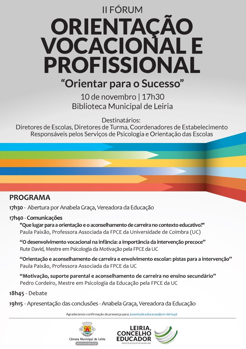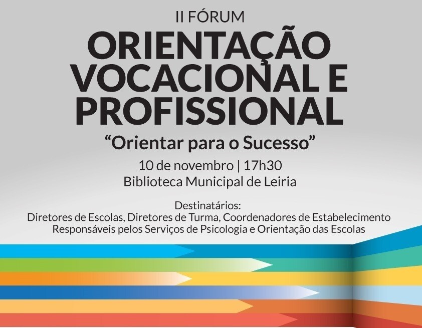 O Município de Leiria realiza nesta terça-feira, dia 10 de novembro, o II Fórum Orientação Vocacional e Profissional dedicado ao tema "Orientar para o Sucesso", na Biblioteca Municipal Afonso Lopes Vieira, a partir das 17h30.