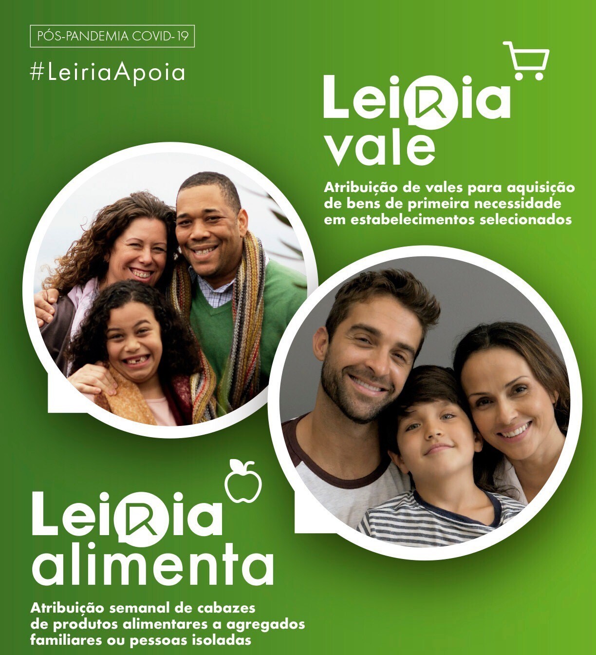 No caso do Programa Leiria Alimenta, o apoio é atribuído na forma de cabazes de produtos de primeira necessidade, sendo também destinado a agregados familiares ou pessoas isoladas que, comprovadamente, demonstrem a perda ou inexistência de rendimentos, na sequência da crise Covid-19, e, em consequência, não se encontrem a ser salvaguardadas as suas necessidades básicas, nomeadamente alimentares, e não beneficiem de apoio noutro programa municipal.