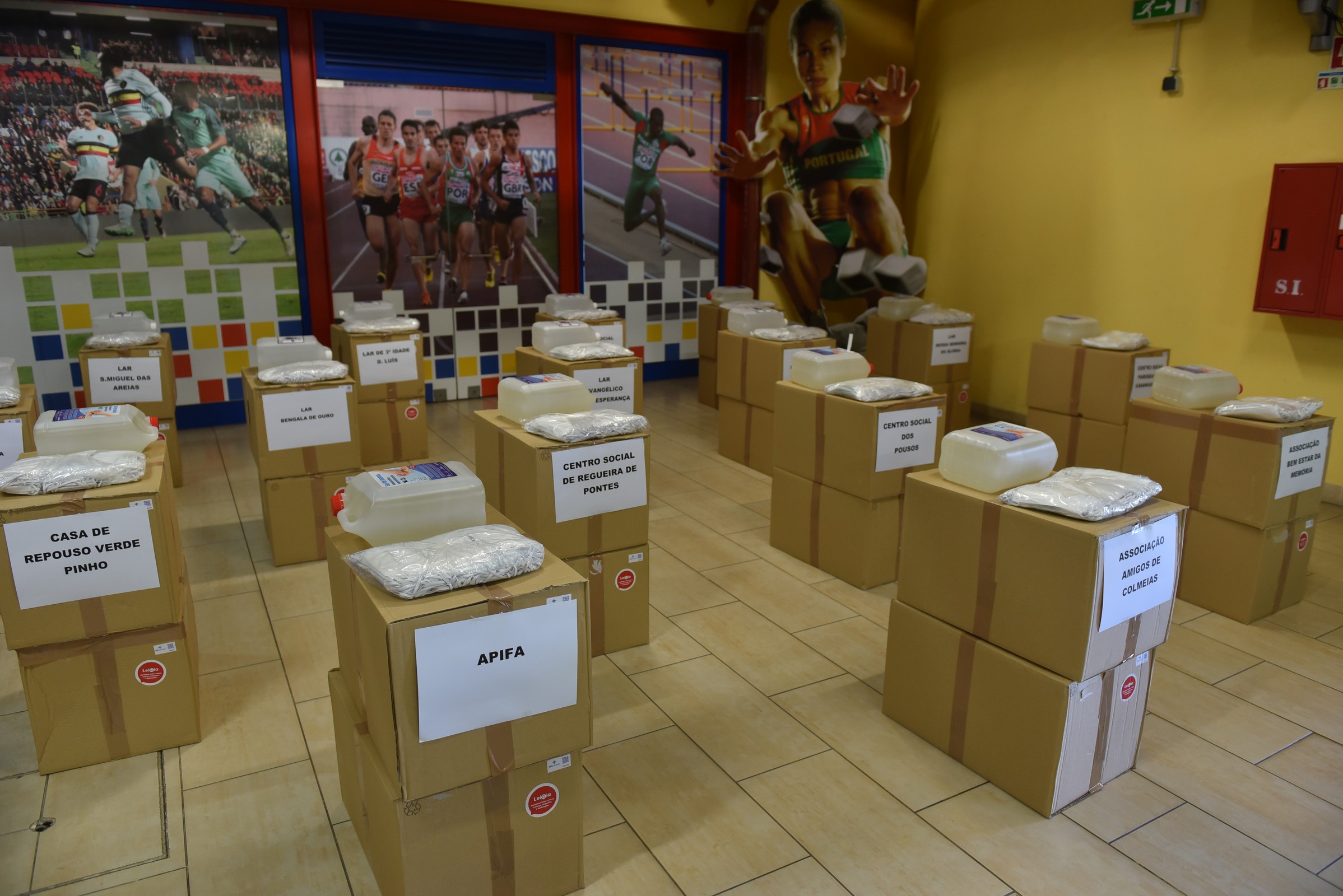 Para evitar a concentração de um elevado número de pessoas no mesmo local, a entrega dos equipamentos de proteção, efetuada no Estádio de Leiria, é distribuída por datas diferentes, mas de forma célere, para obviar às necessidades sentidas pelos beneficiários dos mesmos.
