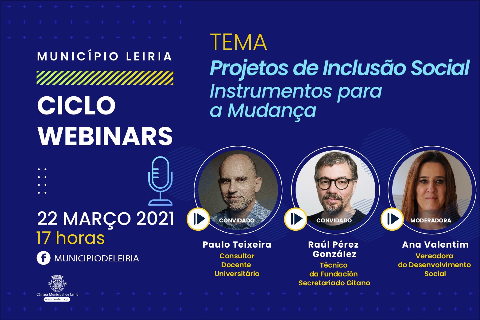 “Projetos de Inclusão Social - Instrumentos para a Mudança” é o tema que se segue no ciclo de webinars promovido pelo Município de Leiria, com transmissão na próxima segunda feira, dia 22 de março, a partir das 17:00, em https://www.facebook.com/municipioleiria
