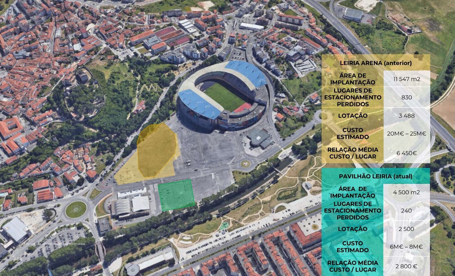 Este pavilhão representa uma poupança de 14 a 17 milhões de euros face à anterior proposta, que, a preços atuais, custaria entre 20 e 25 milhões de euros e sacrificava 830 lugares na zona desportiva contra os 240 da atual proposta.