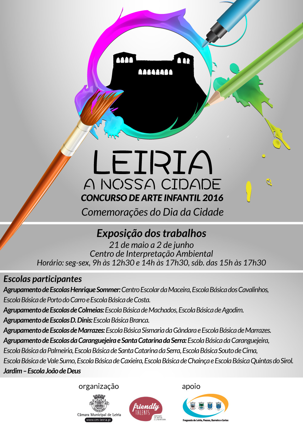 Os trabalhos concorrentes à segunda edição do Concurso de Arte Infantil "Leiria, a Nossa Cidade" vão estar em exposição no Centro de Interpretação Ambiental, de 21 de maio a 2 de junho, uma iniciativa que contou com a participação de alunos do primeiro ciclo do concelho de Leiria e de Nampula, cidade moçambicana geminada com Leiria.