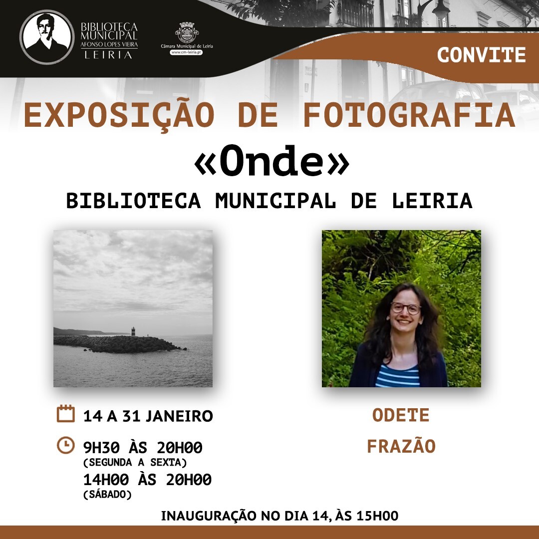 “Onde” é o tema de uma exposição de Fotografia da autoria da Fotógrafa Odete Frazão, que será inaugurada sábado, dia 14 de janeiro, às 15 horas, na Galeria de Arte da Biblioteca Municipal Afonso Lopes Vieira, em Leiria, e que ficará patente até 31 de janeiro.