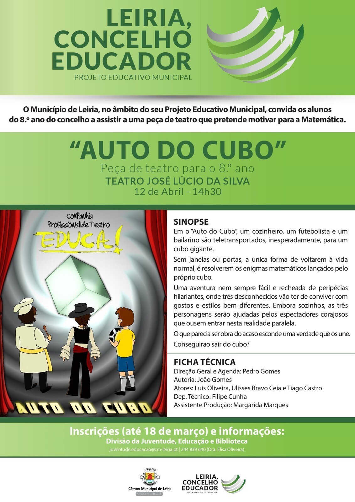 O Teatro José Lúcio da Silva vai ser transformado numa sala de aula gigante para os alunos do oitavo ano das escolas de Leiria no próximo dia 12, às 14:30, sendo ‘professores’ os actores da Companhia Profissional de Teatro “Educa”, que levam a palco o “Auto do Cubo”, uma peça que tem como objectivo motivar para a matemática.