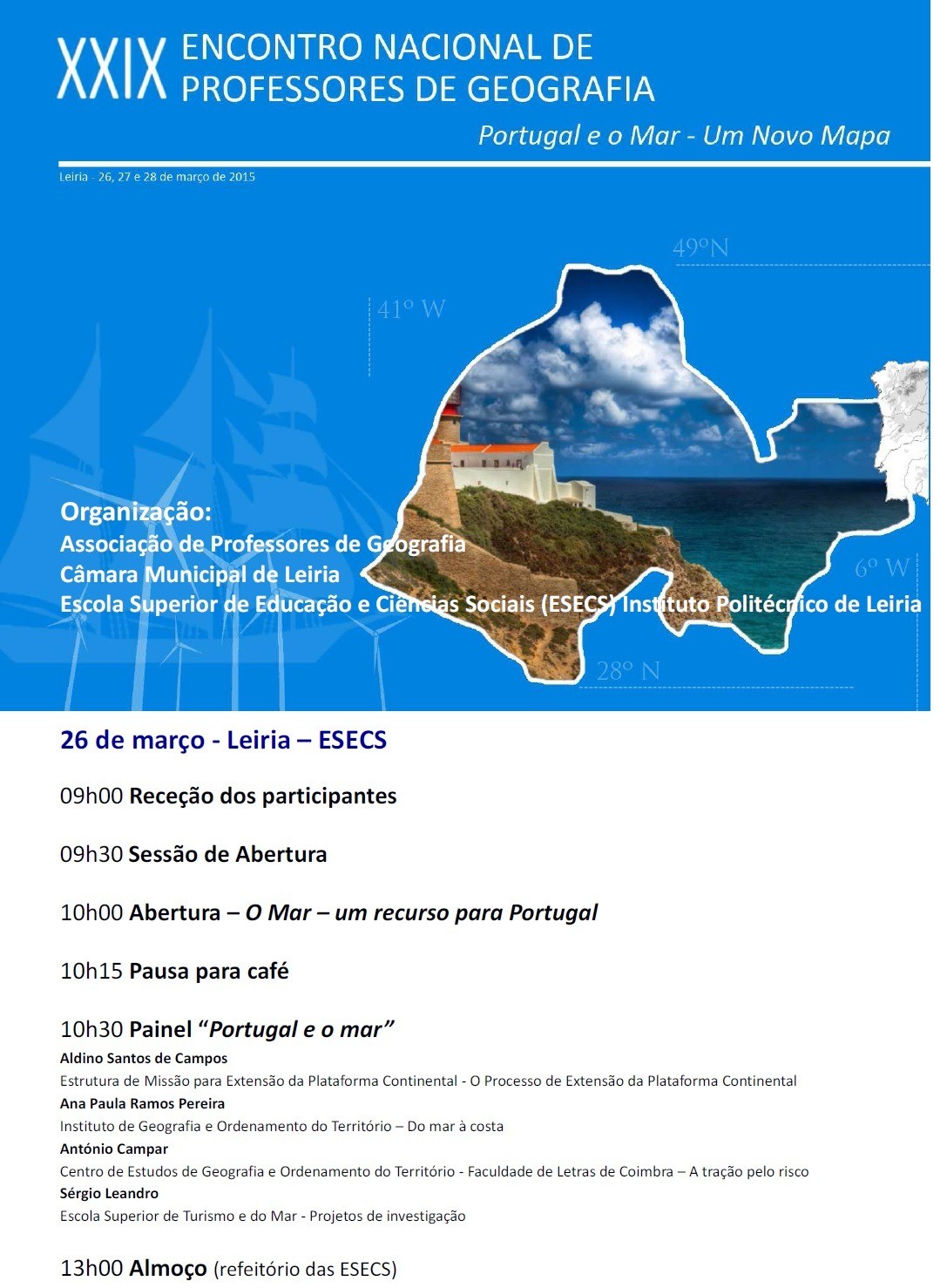 O XXIX Encontro Nacional de Professores de Geografia, dedicado ao tema "Portugal e o Mar: Um Novo Mapa" vai realizar-se este ano em Leiria, de 26 a 28 de março, na Escola Superior de Educação e Ciências Sociais (ESECS), do Instituto Politécnico de Leiria (IPL).
