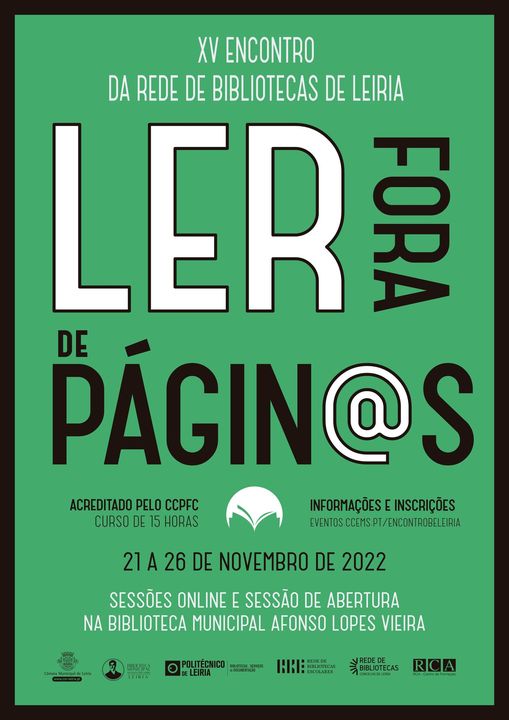 O XV Encontro Anual da Rede de Bibliotecas Escolares de Leiria, promovido pelo Município de Leiria, pelas Bibliotecas do Politécnico de Leiria, pela Rede de Bibliotecas do Concelho de Leiria e pelo Centro de Formação da Rede de Cooperação e Aprendizagem, decorrerá nos dias 21, 23, 25 e 26 de novembro de 2022, maioritariamente em formato online.