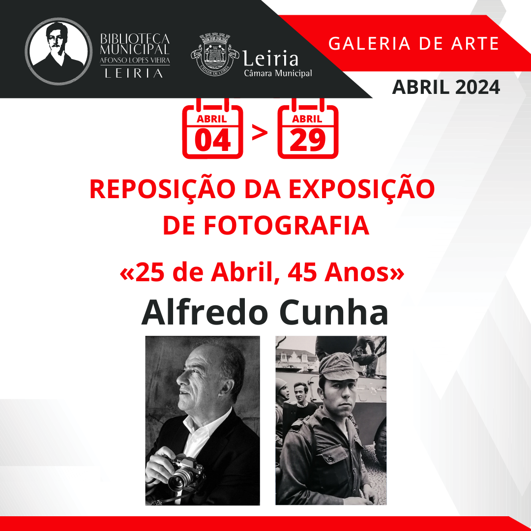 No âmbito das comemorações dos 50 anos do 25 de abril, em Leiria, a Biblioteca Municipal Afonso Lopes Vieira, irá repor, entre 4 e 29 de abril, a exposição de fotografia “25 de abril – 50 anos”, do conhecido fotógrafo de abril, Alfredo Cunha.